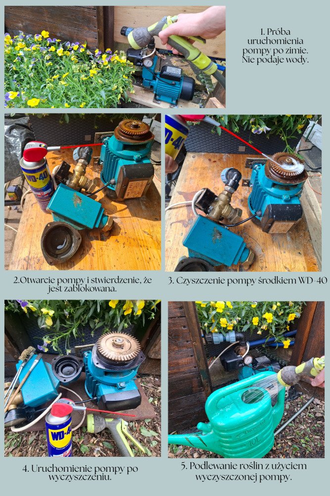 W ramach projektu została odnowiona zardzewiała pompa z napędem elektrycznym, która przez okres zimy była nieużywana i nie podawała wody. Głównym problemem była korozja oraz zatarte elementy mechaniczne. Przy użyciu preparatu WD-40 usunięto rdzę, poluzowano ruchome części i przywrócono sprawność pompy. Po zakończeniu renowacji urządzenie znów działa prawidłowo i może być wykorzystywane do podlewania roślin w ogrodzie.