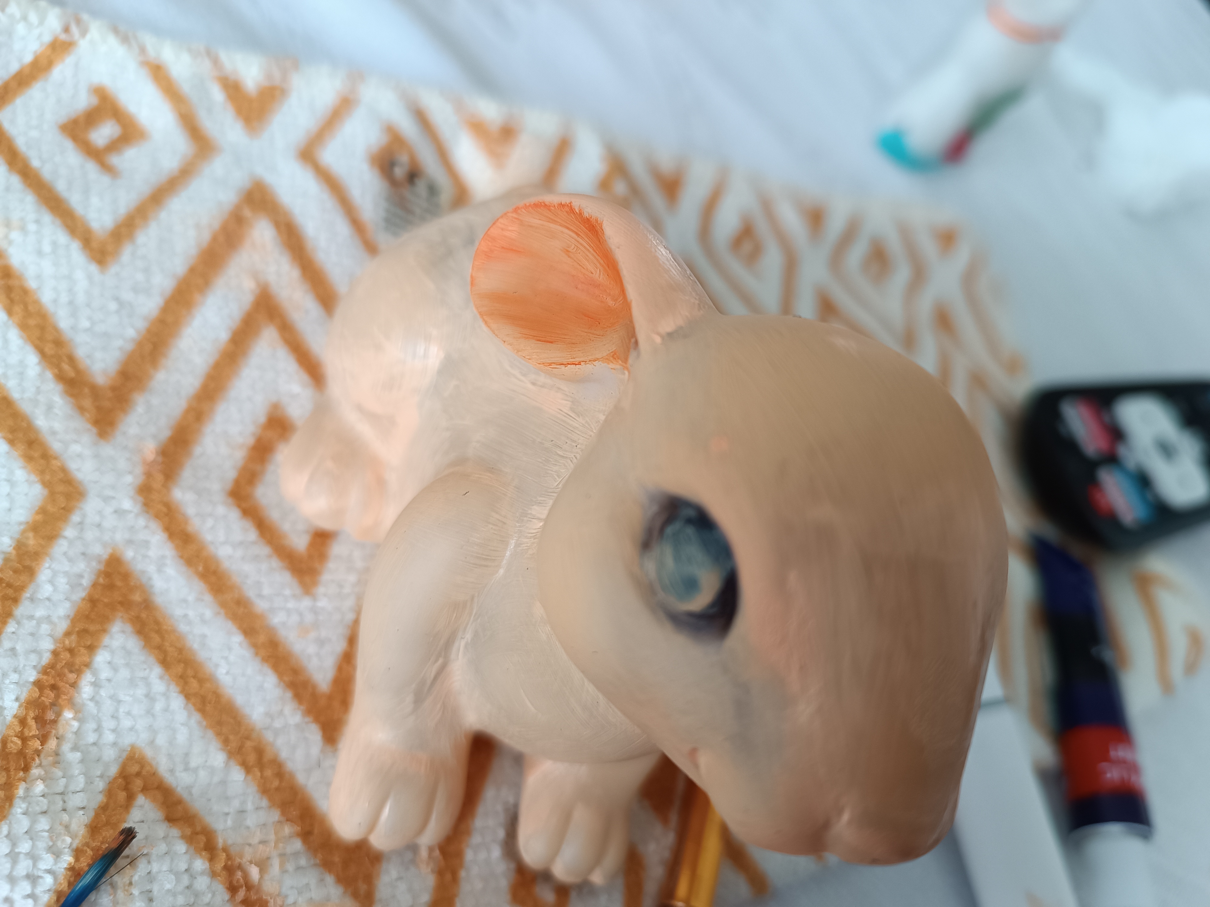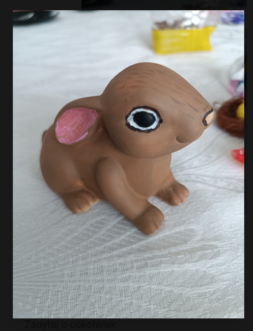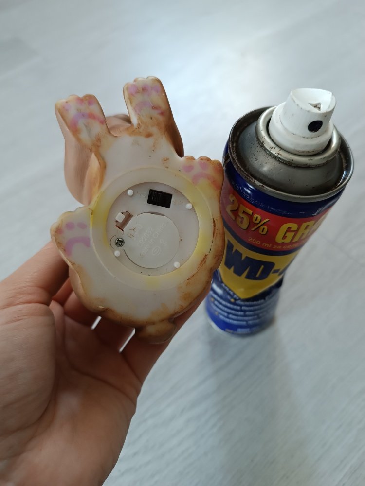 Ta biedna lampka przeżyła bardzo wiele... Malowanie markerami, zalanie sokiem, taplanie się w nieznanej mazi... To wszystko spowodowało, że wyglądała brzydko, nieestetycznie, a w dodatku przestała pełnić swoją funkcję - nie świeciła. Jednak kim bym była, jak nie sobą, widząc w niej potencjał! Po gruntownym czyszczeniu (które nie doprowadziło jej do super stanu), odtłuściłam powierzchnię. Następnie nałożyłam pierwszą warstwę farby akrylowej i położyłam do wyschnięcia. Zabrałam się za szukanie WD-40, bo oczywiście nie zawsze odkładam rzeczy na swoje miejsce 😉. Wracając z puszką miałam nadzieję, że spray da radę z uporczywą śrubką, która blokowała dostęp do baterii. Na szczęście udało się! Pełna nadziei ogarnęłam temat zasilania. Potem dwie kolejne warstwy farby i... Gotowe! Królik wygląda jak nowy, ma piękny, brązowy kolor, a światło, które się z niego wydobywa jest ciepłe i miękkie jak królicze futerko 🙂