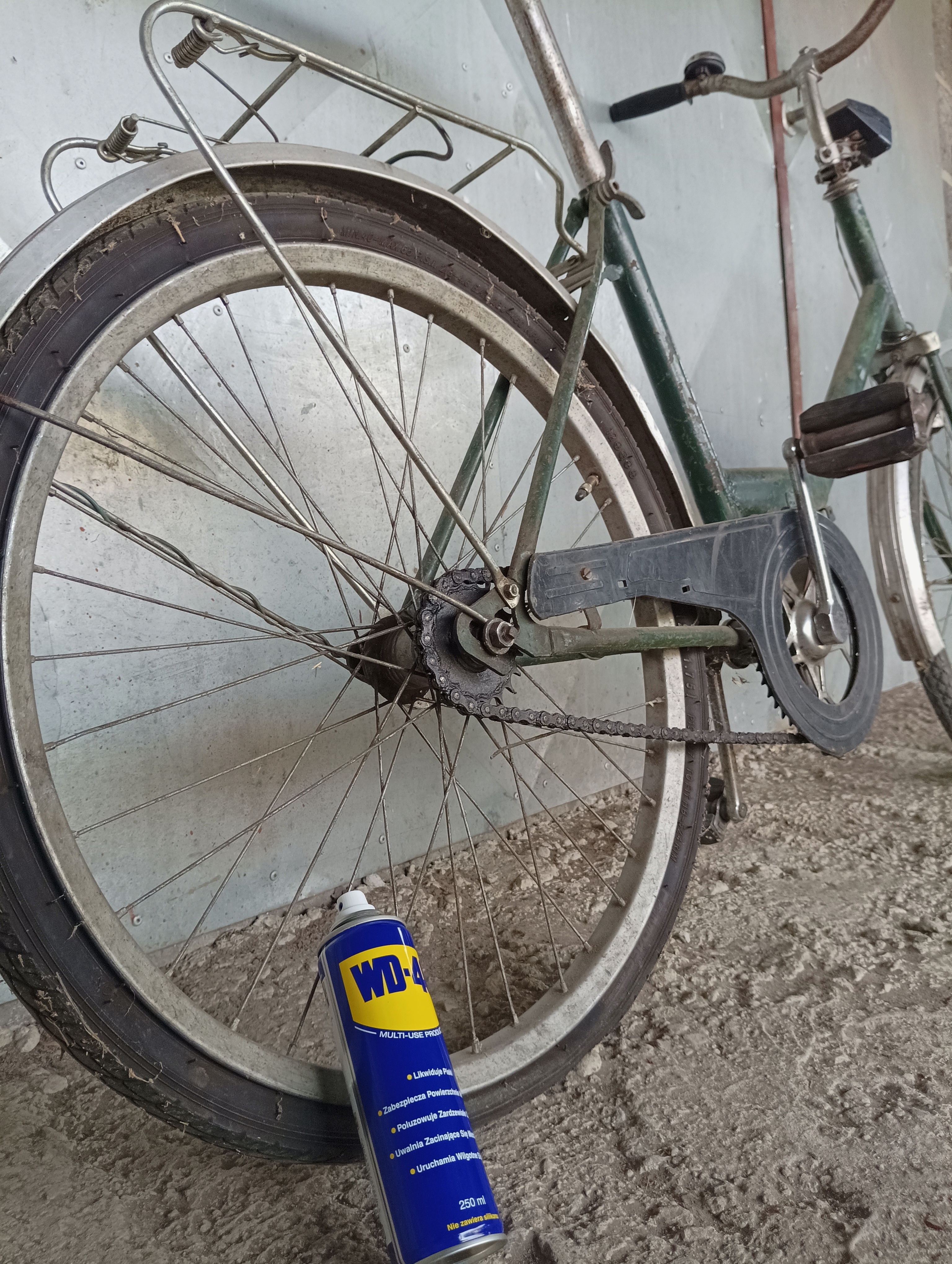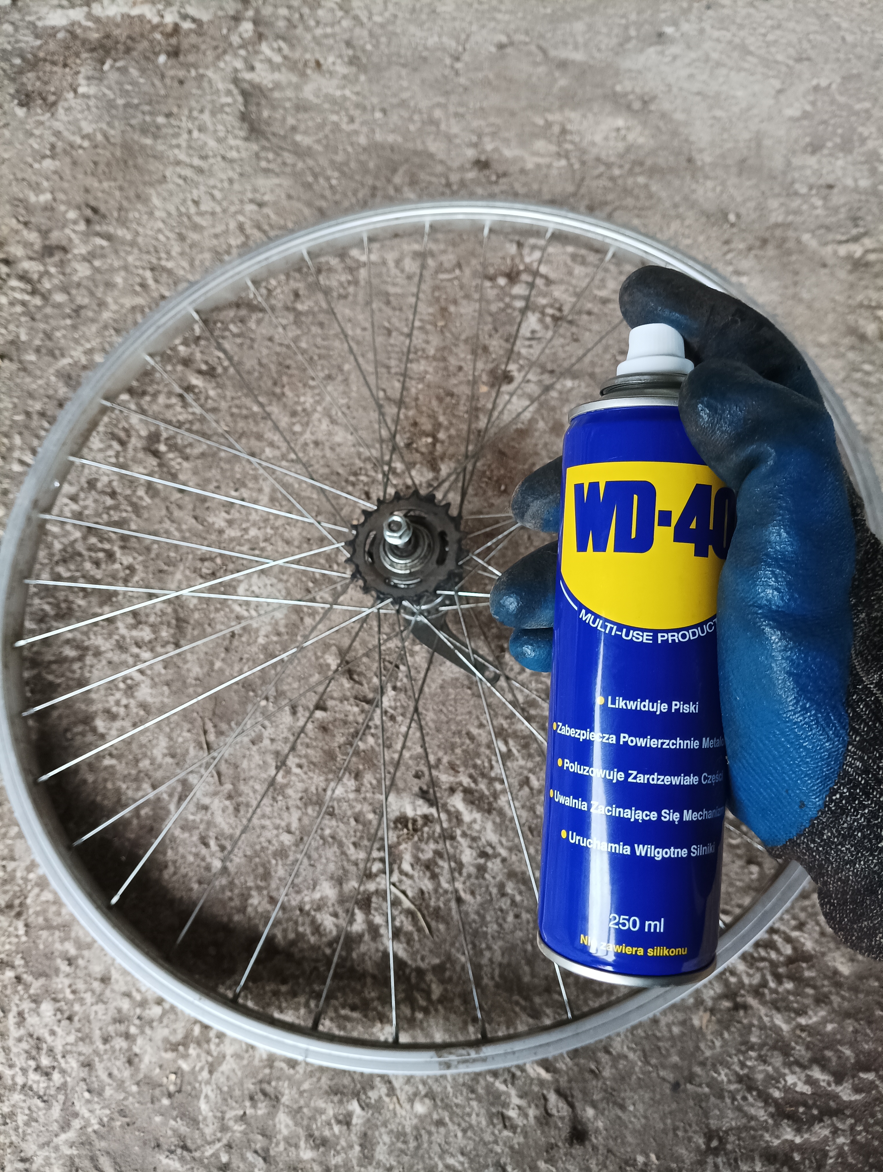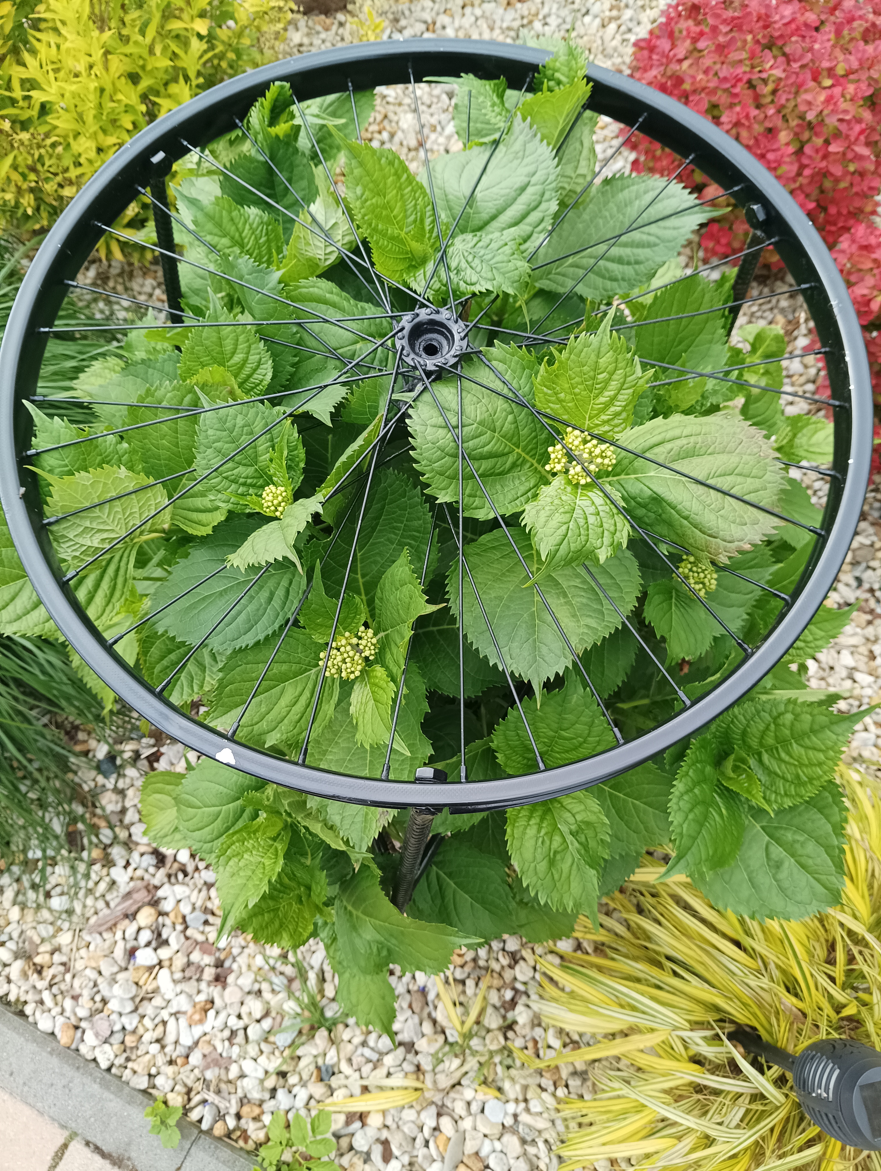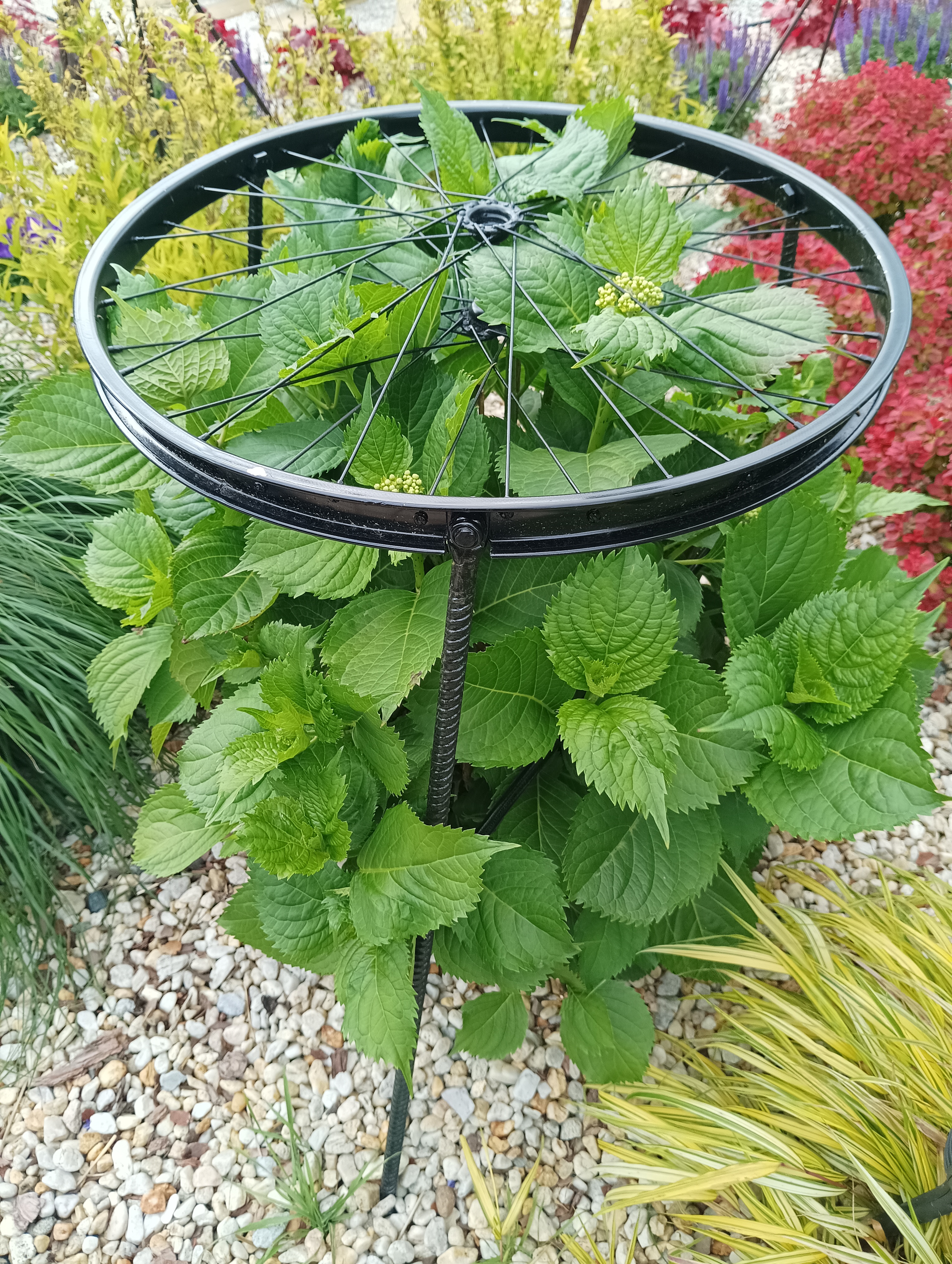 Dzięki WD40 udało się odkręcić stare koło od roweru i wykorzystać je na nowo przy hortensji, którą podpiera by się nie połamała.